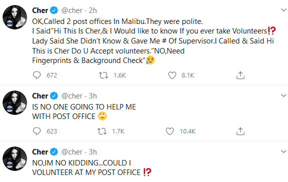 Cher– yes, that Cher — is a patriot down to her million dollar manicure. She’s no Dark Lady. She revealed on Twitter today that she volunteered to work at the Malibu Post Office in light of all the cutbacks at the USPS. She wants to make sure all the ballots are counted!