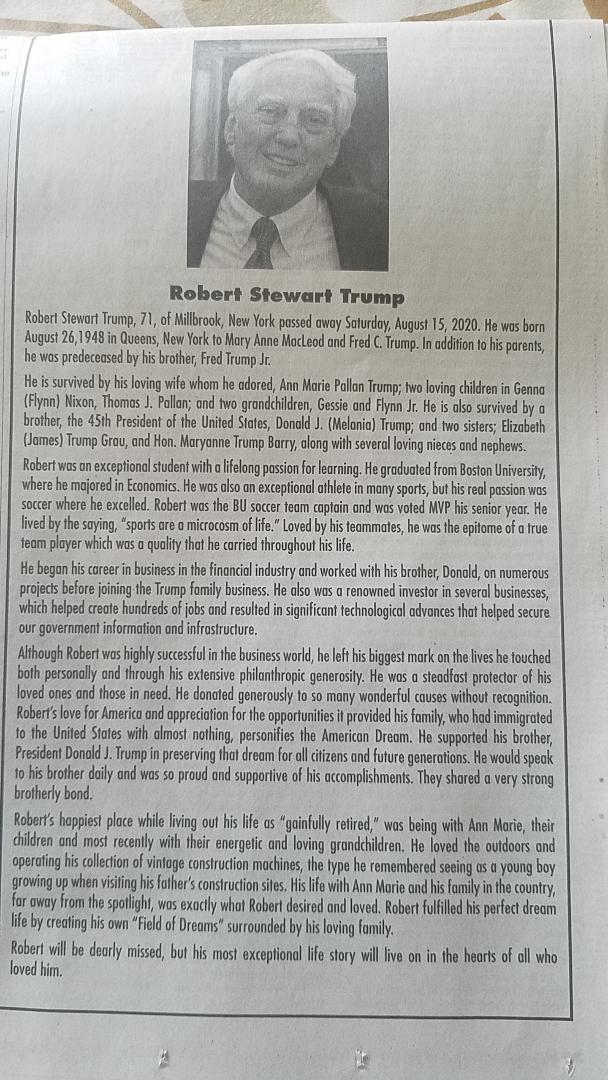 A mysterious large ad– although it’s not marked as an ad– appears on Page 9 on the main section of the New York Times today. It’s an obit for Robert Trump, touting his relationship with the president, his brother, Donald Trump. The obit says Robert Trump supported his brother and spoke to him every day, which is counter to almost everything we’ve heard about the two men.