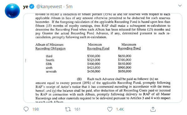 Kanye West is posting pictures of his 2012 contract with DefJam. It looks like he got a $12 million advance in 2012 for his 2013 album, Yeezus. Yeezus is right. The album was not a hit. According to Buzz Angle, “Yeezus” has a sold a total of 609,000 copies. Only 92,000 are CDs and downloads. The rest is all streaming.