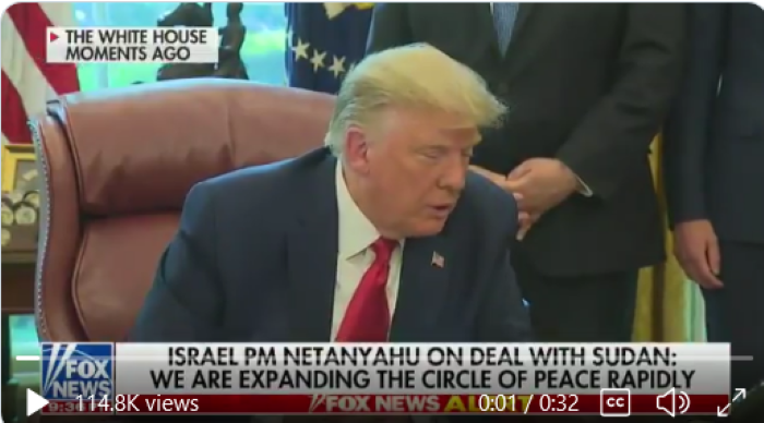 Donald Trump was on a speaker call today with Israeli PM Bibi Netanyahu. Trump called Joe “Sleepy Joe” and tried to get Netanyahu to support his mockery of the Democratic Presidential candidate. The event in the Oval Office was to announce normalization of relations between Israel and Sudan. Listen as Bibi — knowing reporters are in the Oval Office– refuses to do this, and won’t play along with Trump’s game.