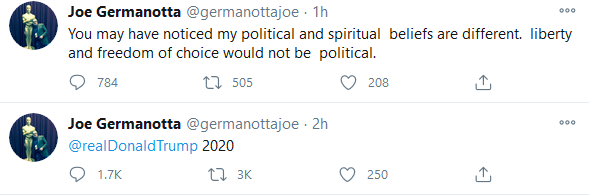 And what’s his excuse? He Tweets: “You may have noticed my political and spiritual beliefs are different. liberty and freedom of choice would not be political.”