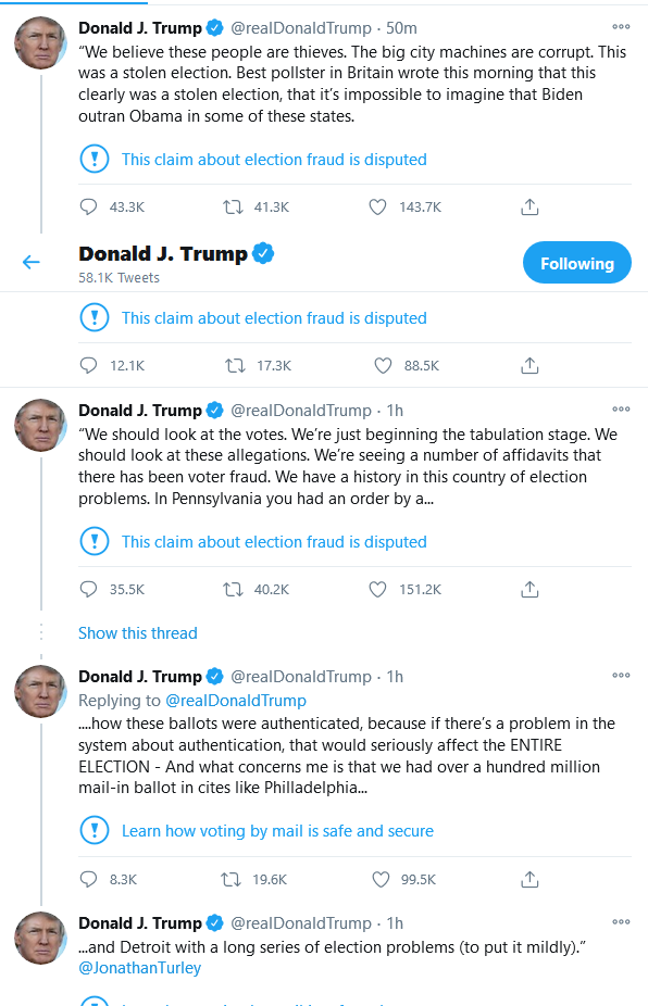 He still doesn’t get it. Donald Trump lost the election. He’s a loser, baby. The cry baby doubled down on the crazy this morning with a series of Tweets that show someone who has lost touch with reality. Twitter, however, has put blue warnings on each Tweet indicating that they are untrue and must be viewed that way.