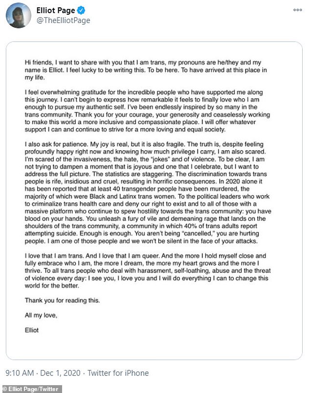 Bravo! Ellen Page was always the coolest kid, and now she’s done something really brave. She’s come out on social media as transgender, she’s now using different pronouns– he/they– and a new name, Elliot. From here on, so be it, Elliot is a terrific actor who’s going to blaze new trails. He says in his post below he’s afraid jokes and hate. There better not be any of that. Welcome, Elliot!