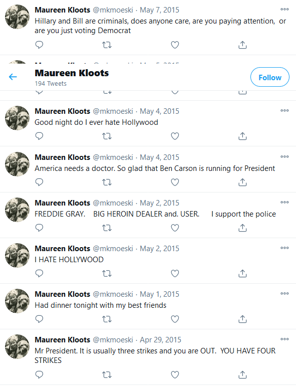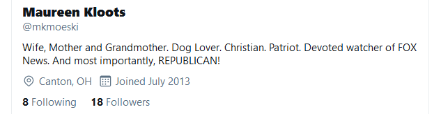 At the top of her Twitter account, still active, Maureen Kloots describes herself as “Wife, Mother and Grandmother. Dog Lover. Christian. Patriot. Devoted watcher of FOX News. And most importantly, REPUBLICAN!”