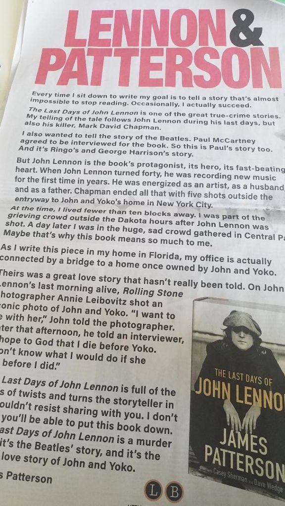“The Last Days of Lennon” is a must avoid. But the full page ad? Now that’s worth reading. It’s all about Patterson: he was nearby when Lennon was killed by Mark David Chapman, he was in the “grieving crowd” in front of the Dakota afterwards. He lives now in a house that’s connected by a bridge to a house John and Yoko once looked at.