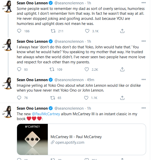 Sean Lennon has come to Twitter to defend his mother, Yoko Ono, and to counter what he sees as the wrong idea about his late dad, John Lennon.