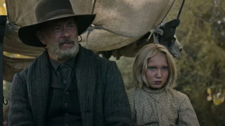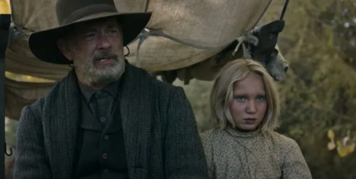 Maybe with Joe Biden at the helm, decency has increased cache: Capt. Kidd, coming upon a rogue child, a doubly traumatized blond 10-year old he calls Johanna in the woods (the superb German actress Helena Zengel), takes it upon himself to bring her home. America is still the wild west, and much of this trip through harsh landscapes chased by desperadoes, is beautiful to look at, yet harrowing. Having been a newspaper man in San Antonio prior, Capt. Kidd now travels town to town delivering “news of the world” in performance. You can see the blatant connection between media and entertainment as folks gather to hear him. Unlike other showmen, Kidd is dedicated to telling “truth” stories read from newspaper headlines; and, facing his own sense of judgment, he has a dark secret for which he must atone.