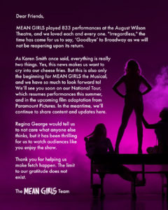 This is interesting. Yesterday, Paramount announced a film version of “Spamalot” directed by Casey Nicholaw. Today their theatrical division pulled the plug on the Nicholaw-directed “Mean Girls” on Broadway. The show is done. Based on Tina Fey’s original film, “Mean Girls” was not a great stage show, but it will get a national tour and probably do well in summer stock. But it wasn’t a tremendous hit on Broadway, and no one was waiting for it to return. Paramount, they say, will do a movie version of the musical.