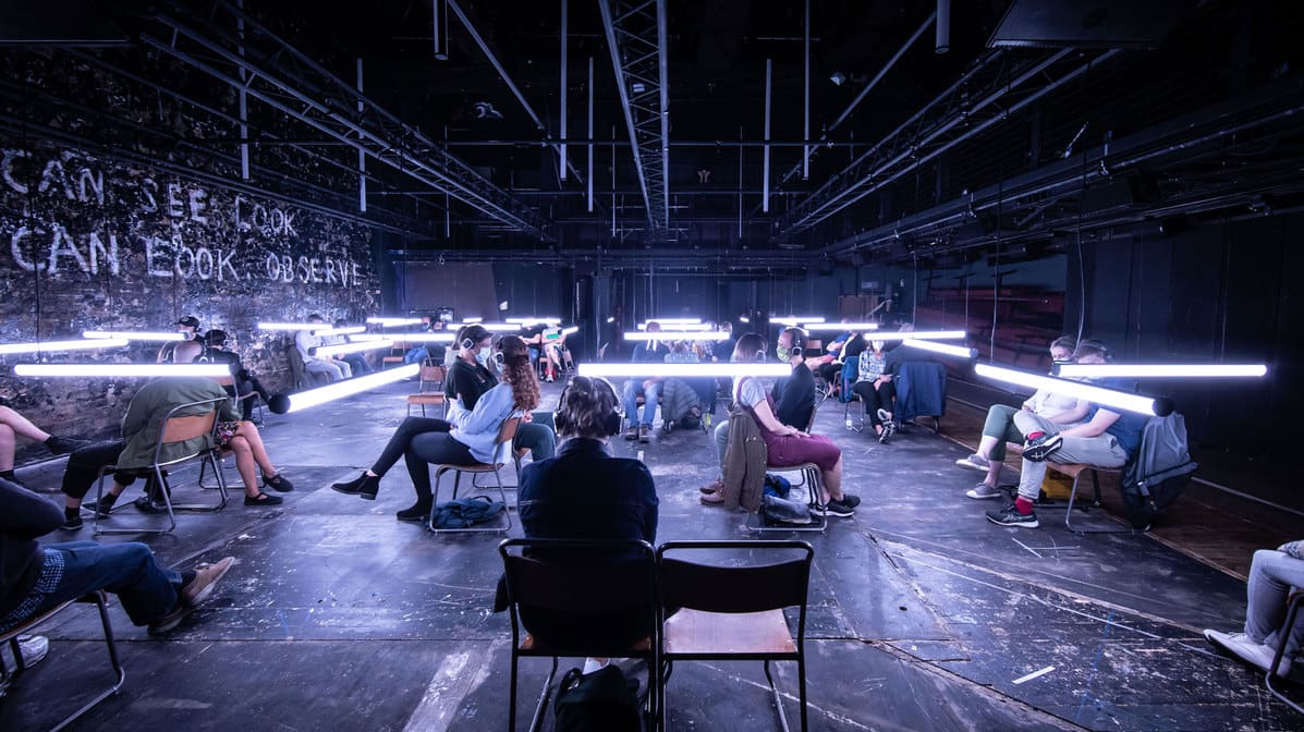 If I have to ease into live theater, “Blindness” is a great conduit, and an event. At the Daryl Roth Theater, temperature taken, health form complete, viewers file into the cavernous space fitted with lighting fixtures, a neon of color; seats, two together, are distanced. Headsets in place like bunny ears, you are ordered to situate them properly, left ear, right ear, the authoritarian British voice commands, repeat. This is important for a visceral experience based on Jose Saramago’s famed novel, in Simon Stephens’ trim adaptation. Everything depends on sound and light. Sight too, or lack of it.