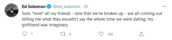 She likes screenwriters. She dated one at least in 2019, if not sooner. His name is Ed Solomon, he wrote the “Bill and Ted” movies with Keanu Reeves and Alex Winter. He also wrote “Men in Black.” In the latter movie, Will Smith and Tommy Lee Jones have a little device that wipes out peoples’ memories. Hmmmm….