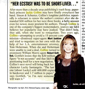 Over the years I got to know Jackie and sometime around 1995 I wound up in Jack Romanos’s office at Simon & Schuster doing her a favor. The result was the article at the left. I think Michael Korda was having trouble getting her a new contract, and Jackie was adrift at S&S. She needed a boost to get the publisher to re-up with her. So I volunteered to go on over there and write a piece about her stock being on the rise again. Well, it worked. And that cemented our friendship for the next 20 years.
