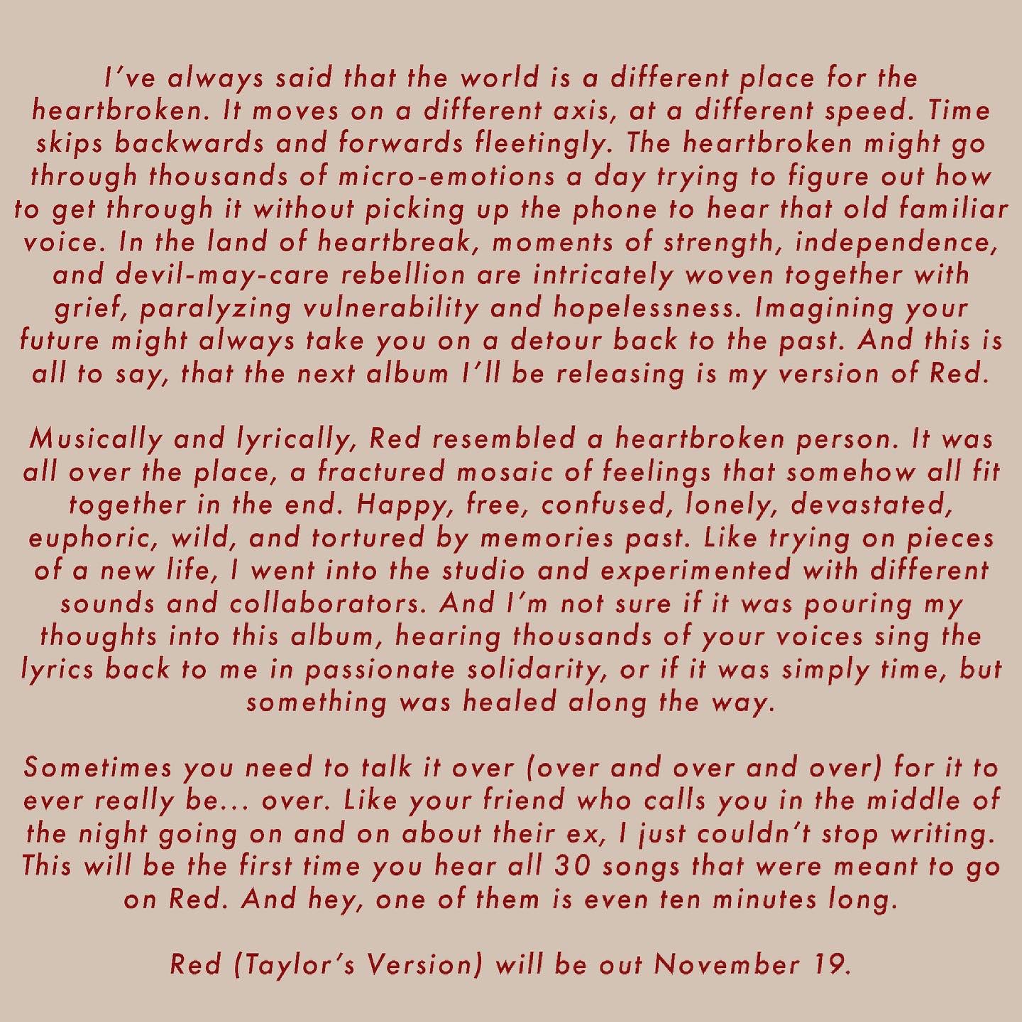 The new version of “Red,” she says, will have all 30 tracks she intended for it in the first place. Here’s what she posted: