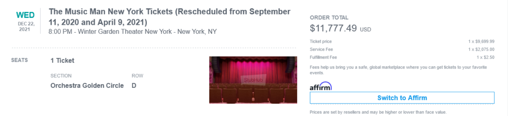 You’d really have to want to see Jackman as Harold Hill in a big way. Of the total $11,777.49, $2000 of it is a service charge. You still have to pay also for a drink, a snack, merchandise, and so on. So that could run another 100 clams.