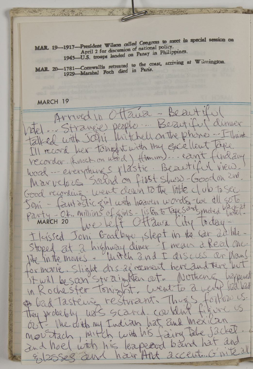 “talked with Joni Mitchell on the phone. I think I’ll record her tonight with my excellent tape recorder (knock on wood) . . . hmmm . . . can’t find any wood . . . everything’s plastic”