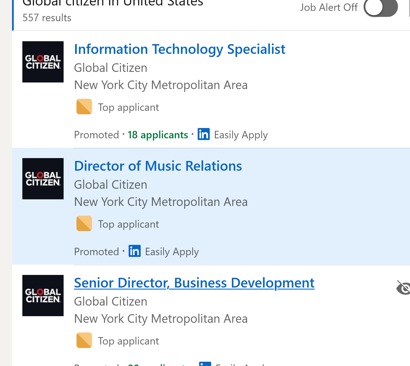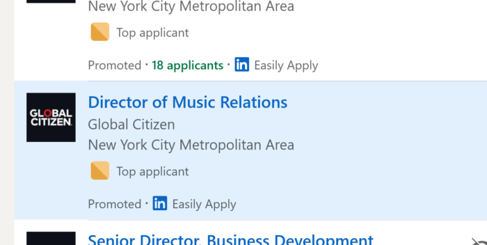 Back on July 5th, Global Citizen posted a help wanted ad on LinkedIn for a Director of Music Relations. They’re still looking.