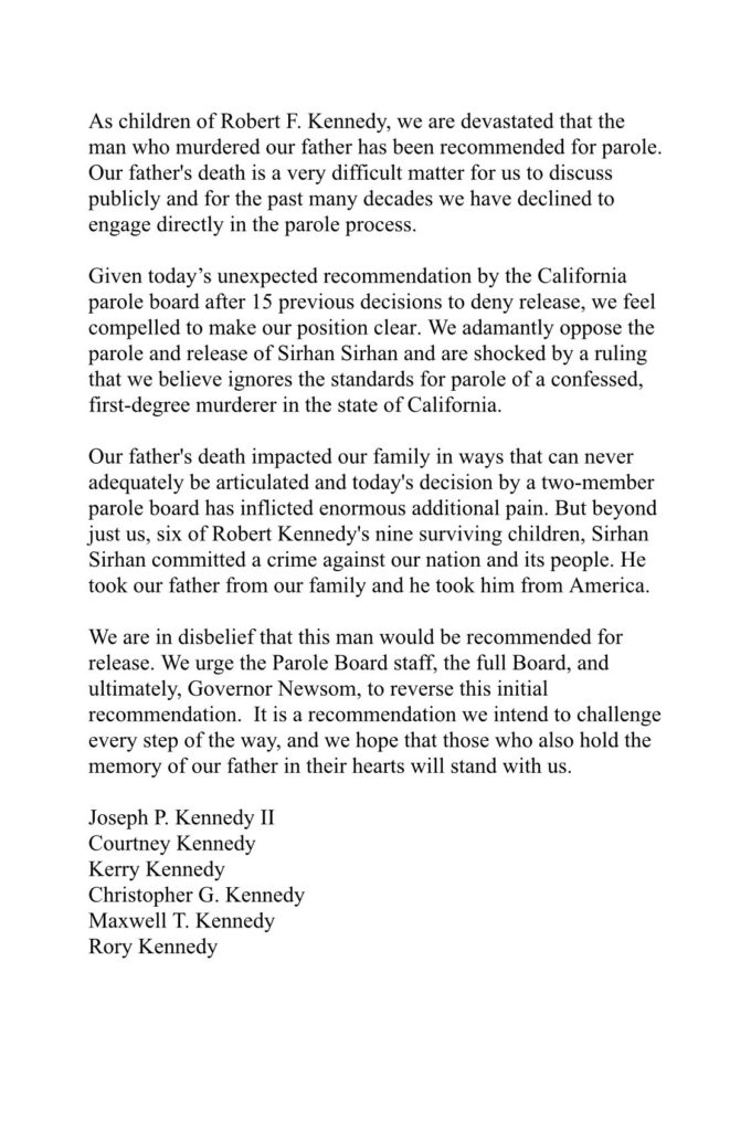 But now cooler heads prevail. Rory Kennedy, RFK’s sensible and talented filmmaker daughter, has organized her siblings against the parole. She writes on Twitter that the level headed children of RFK will challenge the decision. She writes, in part: “We are in disbelief that this man would be recommended for release.”