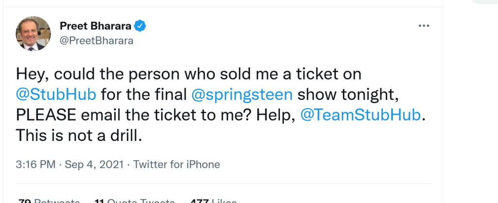 Preet Bharara, ex US Attorney for the Southern District of New York, is panicking with good reason. He says on Twitter that he bought a ticket to tonight’s final “Springsteen on Broadway” and that the seller has not sent it. This is not going to end well if that ticket doesn’t show up pronto. Bigger question: why is this famed attorney/author/podcaster going on StubHub? Why didn’t he call Springsteen’s PR or manager? This is not going to end well for StubHub or for the seller!