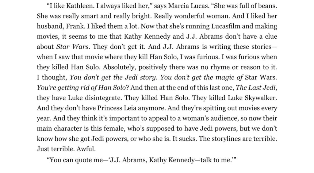 She told Rinzler: “I Like Kathleen. I always liked her. She was full of beans. She was really smart and really bright. Really wonderful woman. And I liked her husband, Frank {Marshall]. I liked them a lot. Now that she’s running Lucasfilm and making movies, it seems to me that Kathy Kennedy and J.J. Abrams don’t have a clue about ‘Star Wars.’ They don’t get it. And JJ Abrams is writing these stories — when I saw that movie where they kill Han Solo, I was furious. I was furious when they killed Han Solo. Absolutely, positively there was no rhyme or reason to it. I thought, You don’t get the Jedi story. You don’t get the magic of ‘Star Wars.’ You’re getting rid of Han Solo?”