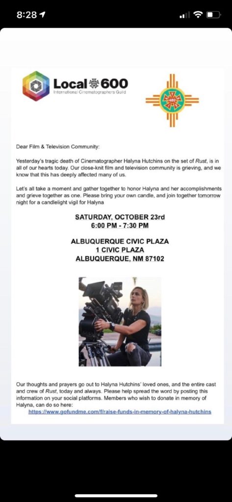 I’m told a private memorial service is being held right now for Halyna Hutchins, the beloved cinematographer killed yesterday on the set of “Rust” in Santa Fe. Her husband and son are attending, and sources say there are grief counselors on the scene. Alec Baldwin is in attendance.