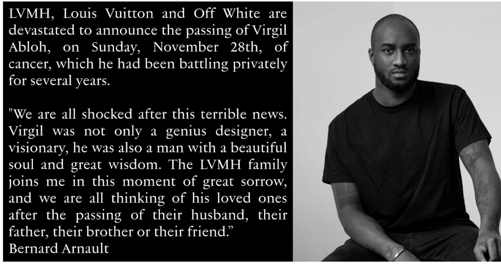 We are devastated to announce the passing of our beloved Virgil Abloh, a fiercely devoted father, husband, son, brother, and friend. He is survived by his loving wife Shannon Abloh, his children Lowe Abloh and Grey Abloh, his sister Edwina Abloh, his parents Nee and Eunice Abloh, and numerous dear friends and colleagues.