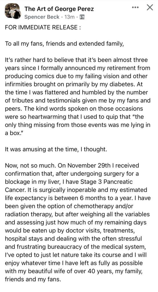 The worlds of Marvel and DC Comics are abuzz today and not in a good way. Legendary artist and writer George Perez, whose work on “The Avengers” and “Wonder Woman” and many other series is famous, announced he’s dying from stage 3 pancreatic cancer. On social media, Perez says he has six months to live.