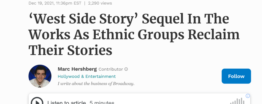 But Forbes.com, still using a network of amateurs to fill its website pages, posted an announcement of such a project two days ago. It was actually called “‘West Side Story’ Sequel In The Works As Ethnic Groups Reclaim Their Stories” by someone named Marc A. Hershberg. His bio says he coves the business of theater. He’s also an entertainment lawyer, he says.