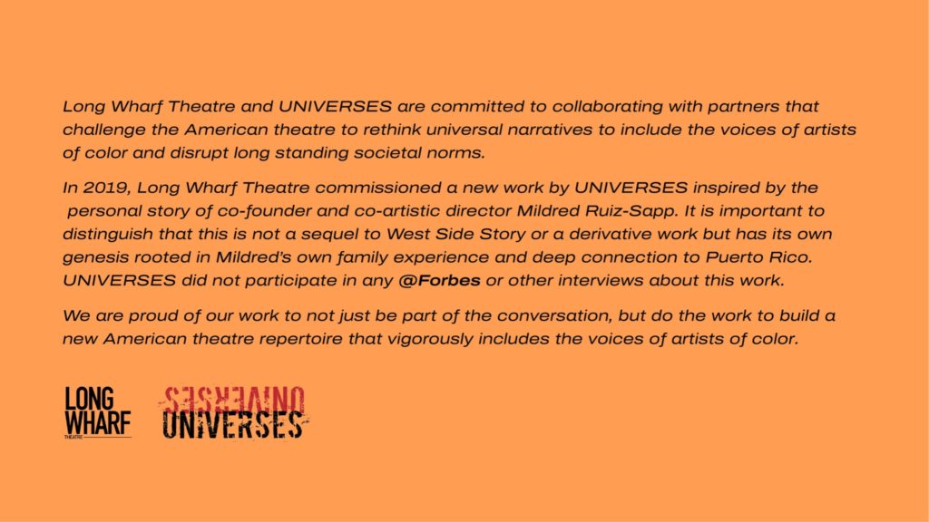 Today Long Wharf Theater in New Haven had to issue a denial and explanation of their “Maria,” which you can see below. The YouTube discussion is below that.