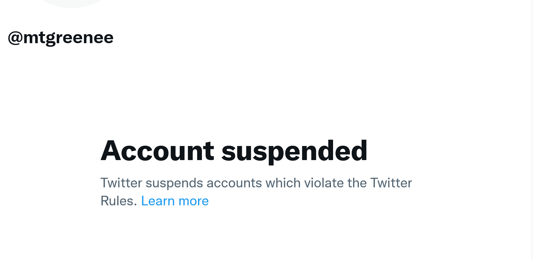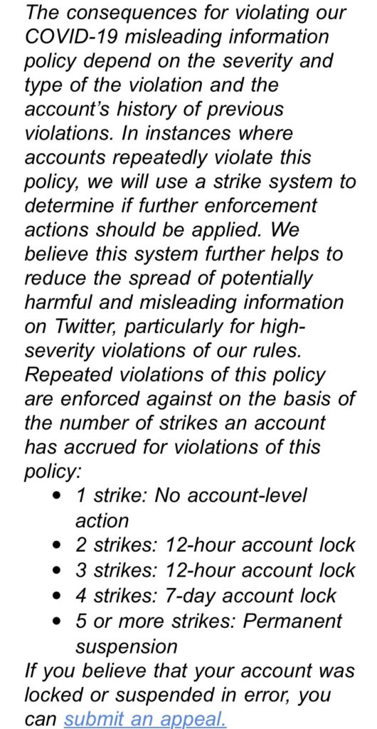 The Twitter ban is over Greene’s spreading of misinformation about COVID-19. But it’s not a complete ban. She she still has access to her government account. When Twitter turns that one off, we’ll be rid of her at least on this platform.