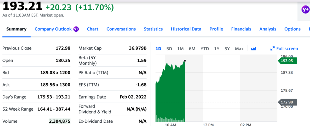 The stock is up 12% or 20 bucks and still rising 95 minutes after the stock market opened.