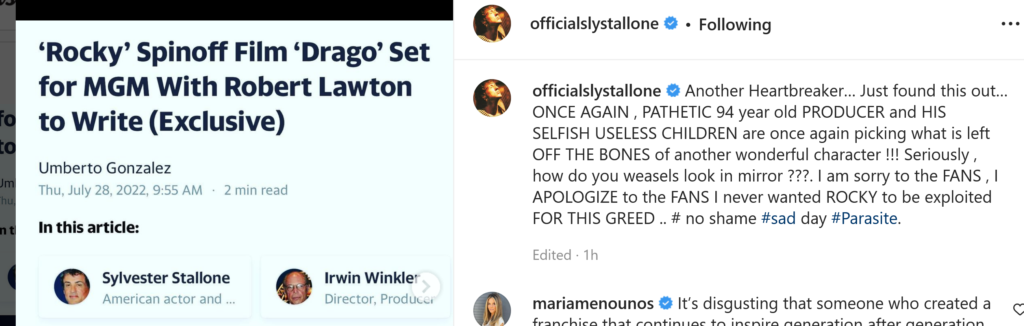 Stallone wrote on Instagram tonight: “Another Heartbreaker… Just found this out…ONCE AGAIN , PATHETIC 94 year old PRODUCER and HIS SELFISH USELESS CHILDREN are once again picking what is left OFF THE BONES of another wonderful character !!! Seriously , how do you weasels look in mirror ???. I am sorry to the FANS , I APOLOGIZE to the FANS I never wanted ROCKY to be exploited FOR THIS GREED .. # no shame #sad day #Parasite.”