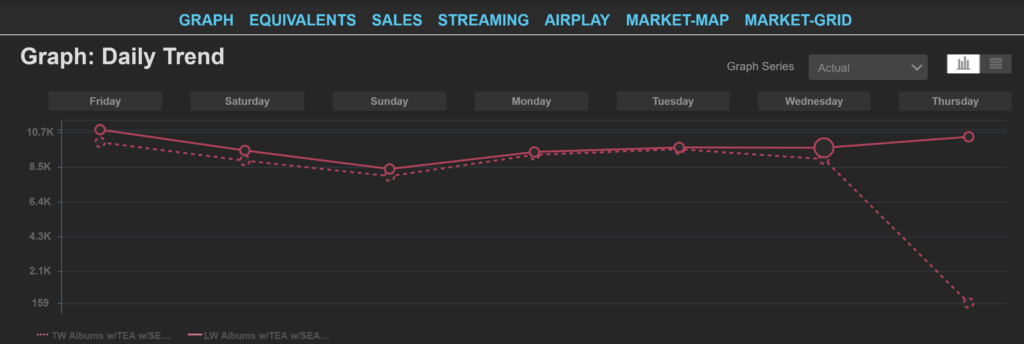 Mid week, after story after story of West (do not call him “Ye”) persisting in anti-Semitic remarks, the bottom finally dropped out of his record sales. Most of West’s sales come from streaming. On Thursday, his streaming numbers week to week dropped from an average of around 9,000 a day to nearly zero– 159 copies. On Thursday, West sold zero physical albums according to Luminate.
