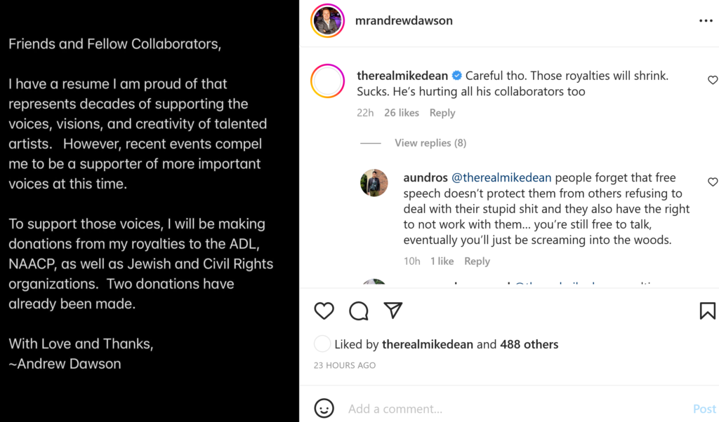 One long time producer, Andrew Dawson, is a mensch. He wrote on social media that he’s making donations to the Anti-Defamation League, the NAACP, and other civil rights organizations.