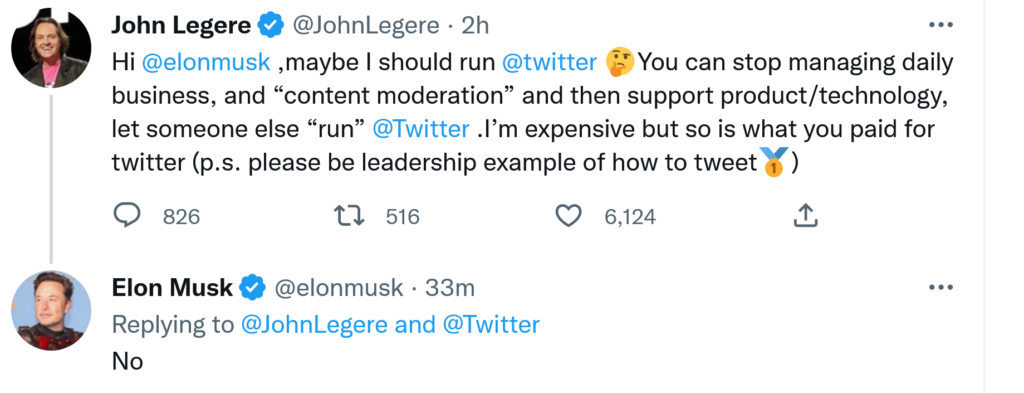 John Legere, founder and former CEO of T Mobile, feels the pain this morning. He offered to run Twitter for Elon Musk. Musk responded with one word: No.