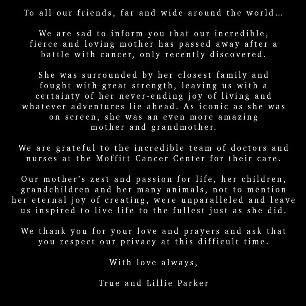 “To all our friends, far and wide around the world… We are sad to inform you that our incredible, fierce and loving mother has passed away after a battle with cancer, only recently discovered,” reads the statement. “She was surrounded by her closest family and fought with great strength, leaving us with a certainty of her never-ending joy of living and whatever adventures lie ahead. As iconic as she was on screen, she was an even more amazing mother and grandmother.”