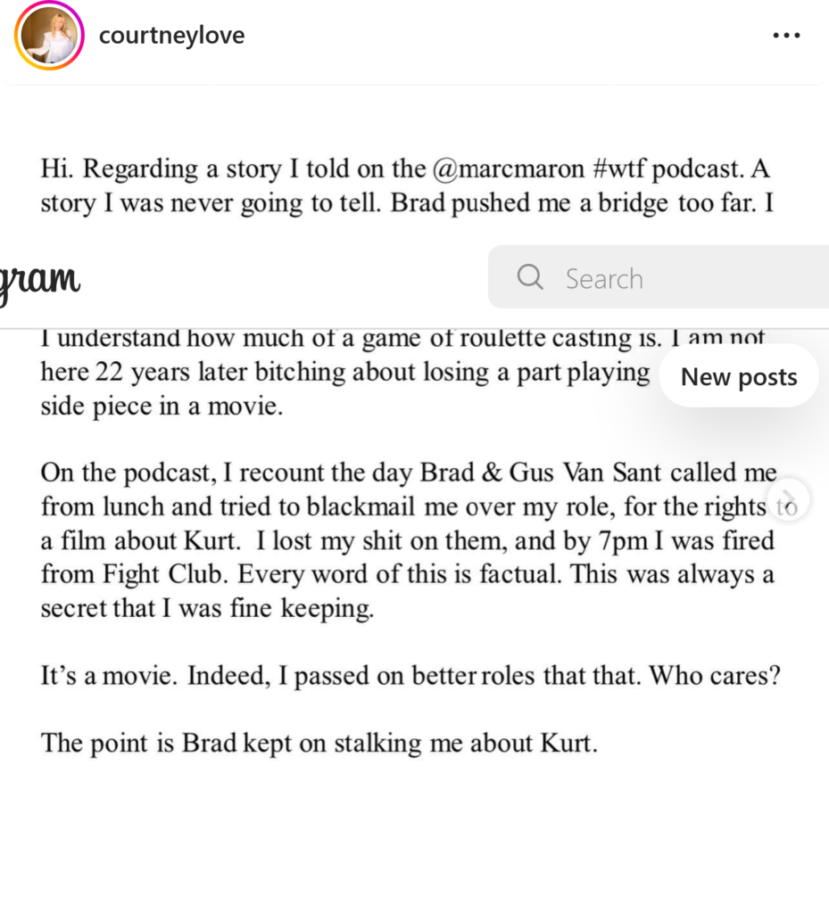 Today, she posted a reaction to the reaction over her podcast interview with Marc Maron. Courtney says that she wanted a role and got one in David Fincher’s “Fight Club” starring Brad Pitt and Love’s then boyfriend Edward Norton.