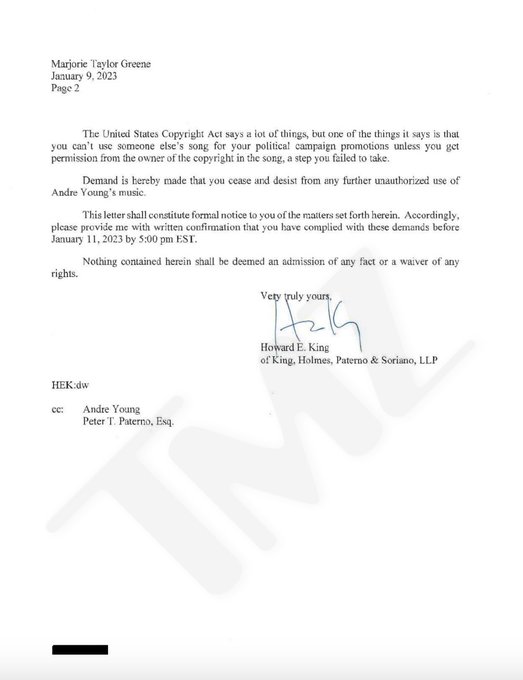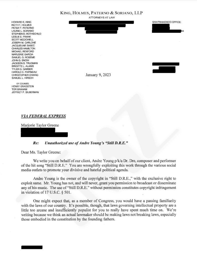 The great rapper and headphone entrepreneur Dr. Dre has had it with Congresswoman Marjorie Taylor Greene. He’s sent her a cease and desist letter to stop playing his music at her rallies and on social media. Dre joins a lot of other artists like the Rolling Stones and Bruce Springsteen who’ve demanded politicians not use their music to endorse their campaigns and platforms. In this case, the song is “Still D.R.E.” You can read Dre’s letter here. The best line is: “One might expect that, as a member of Congress, you would have a passing familiarity with laws of our country.” I think he overestimates her understanding of anything.