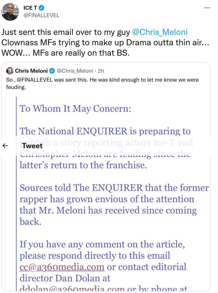 The two guys got right on Twitter and made fun of the whole thing. Ice T called the NE “Clownass MFs).” Meloni says Ice T sent over the email he got from the nearly defunct tabloid. “He was kind enough to let me know we were feuding,” Meloni wrote. A Meloni follower said, “I’m glad I don’t have to choose between you. I think I’d choose Ice T.” To which Meloni responded: “Same.”