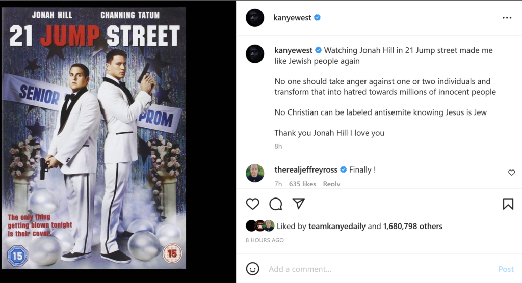 West returned to Instagram over night to say that seeing the movie version of “21 Jump Street,” star Jonah Hill changed his mind about Jews.