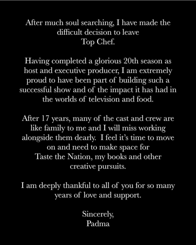 After hosting the show for 20 seasons over the span of 17 years, Padma has said so long. She’s done. Stick a fork in her.