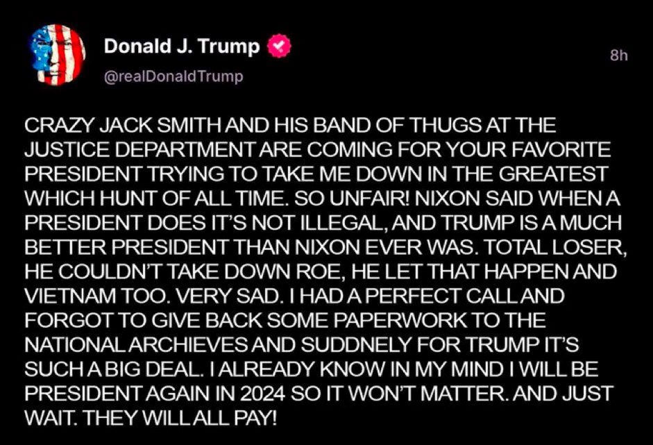 On his Truth Social he responded to his second criminal indictment by having a nervous breakdown. Trump knows his legacy now is First ex-President to be federally indicted twice, also found guilty of sexual abuse in a civil case, and impeached twice by Congress. That’s how his obituary will read. Also, that he buried his ex wife on a golf course. And that he paid off a sex worker not to reveal their affair while his wife was pregnant with their child. And…