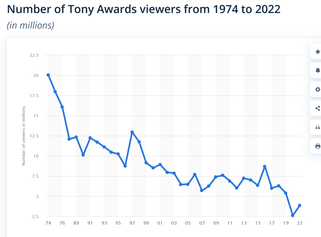 The fact is, the show had no appeal for the mainstream audience once the LGBT stuff kicked in. When one winner declared “I’m a f****t with a Tony!” that was the end. Sorry. And when the two best musical actors showed up in dresses, what did they think would happen? (This isn’t a judgement, just a marketing observation.)