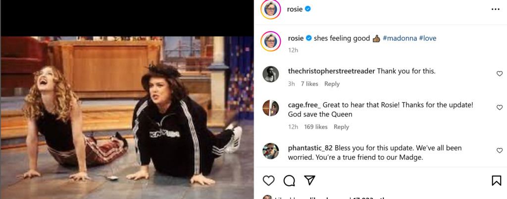 UPDATE: Rosie O’Donnell, Madonna’s close friends, says the pop queen’s “feeling good” after her bacterial infection scare and hospitalization. (For some reason it took TMZ four days to discover she was even in the hospital. So much for their reputation as ambulance chasers.)