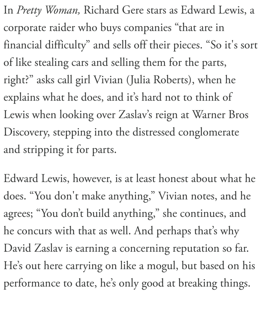 Where did it go? And why? All of that remains unclear. The revised, shorter version is different than the original in that it cuts back to just the facts, ma’am. Bailey’s colorful thoughts about Zaslav being like the Richard Gere character in “Pretty Woman” — he tells Julia Roberts he buys companies to sell off their parts– are gone. There’s also now no mention of the party Zaslav threw in Cannes with Graydon Carter for Warner Bros’ 100th anniversary, or breaking news that he’s trying to sell 50% of the rights to Warner Bros. soundtracks that include songs like “As Time Goes By,” the studio’s signature piece of music.
