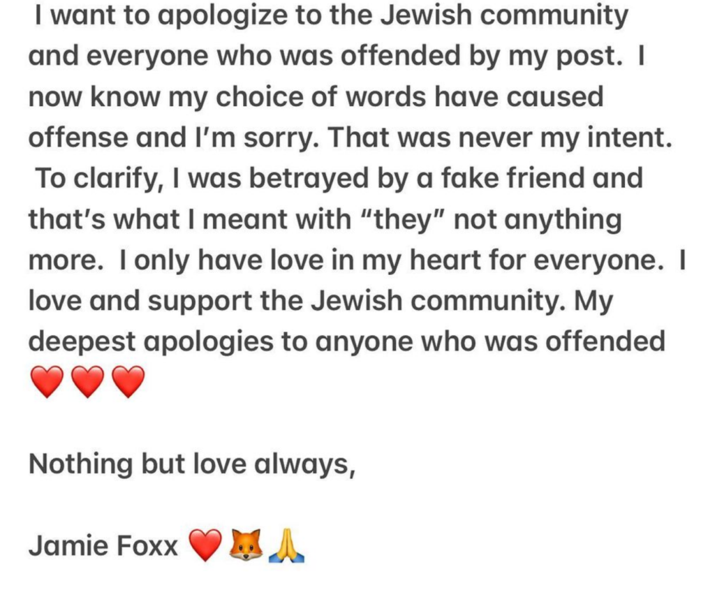 Jamie Foxx is sorry for the poor wording of a post yesterday.
