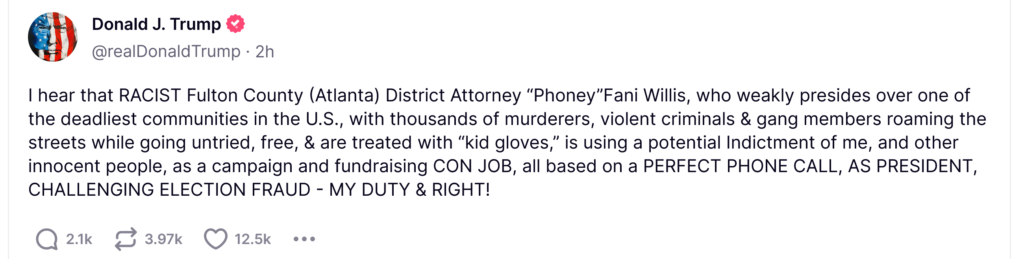 Trump has this morning gone after Atlanta DA Fani Willis, mocking her as “phoney.” Willis is about to bring charges against Trump and many of his cronies and associates over trying to steal the 2020 election.