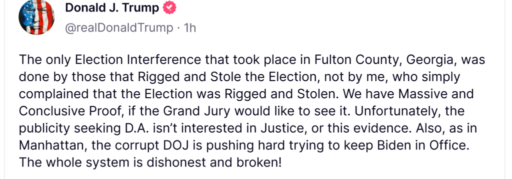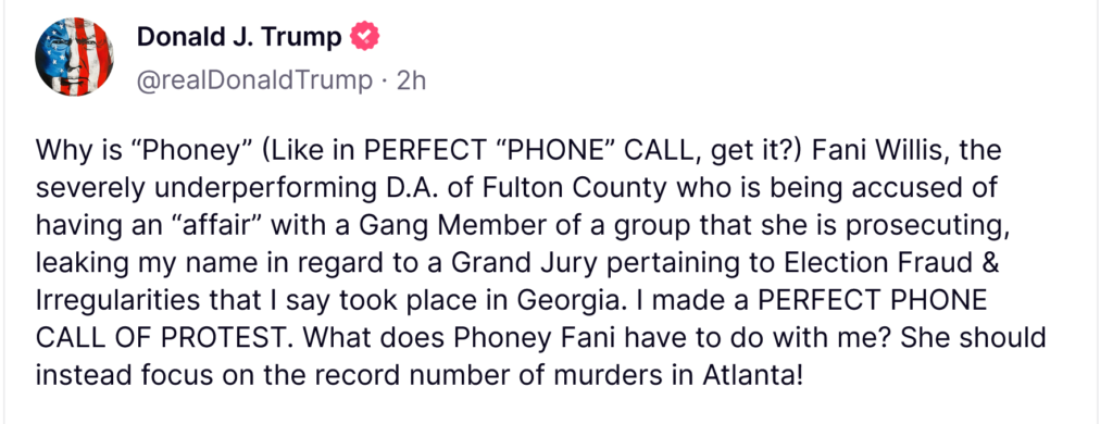 He still thinks his famous phone call to the Georgia Secretary of State looking for extra votes for the 2020 election was a “perfect.” So he’s calling Fulton County District Attorney Fani Willis a “phoney” — a juvenile play on the word phony — and screaming like a stuck pig.
