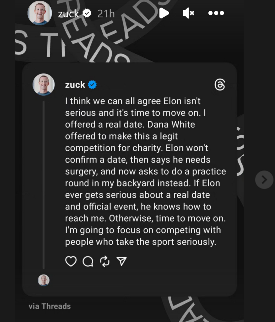 Zuckerberg has replied with a “forget it.” He wants to move on to fighting “serious” opponents. He won’t meet Musk at Dusk.