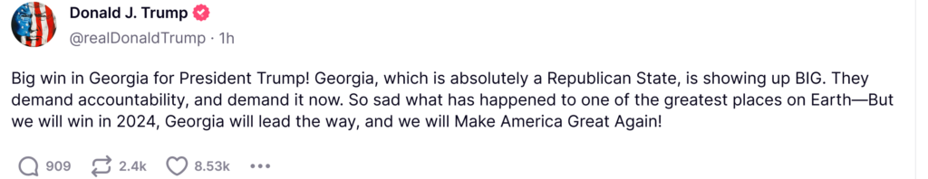 Nevertheless, he writes on social media: “Big win in Georgia for President Trump! Georgia, which is absolutely a Republican State, is showing up BIG. They demand accountability, and demand it now. So sad what has happened to one of the greatest places on Earth—But we will win in 2024, Georgia will lead the way, and we will Make America Great Again!”