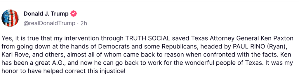 He wrote: “Yes, it is true that my intervention through TRUTH SOCIAL saved Texas Attorney General Ken Paxton from going down at the hands of Democrats and some Republicans, headed by PAUL RINO (Ryan), Karl Rove, and others, almost all of whom came back to reason when confronted with the facts. Ken has been a great A.G., and now he can go back to work for the wonderful people of Texas. It was my honor to have helped correct this injustice!”