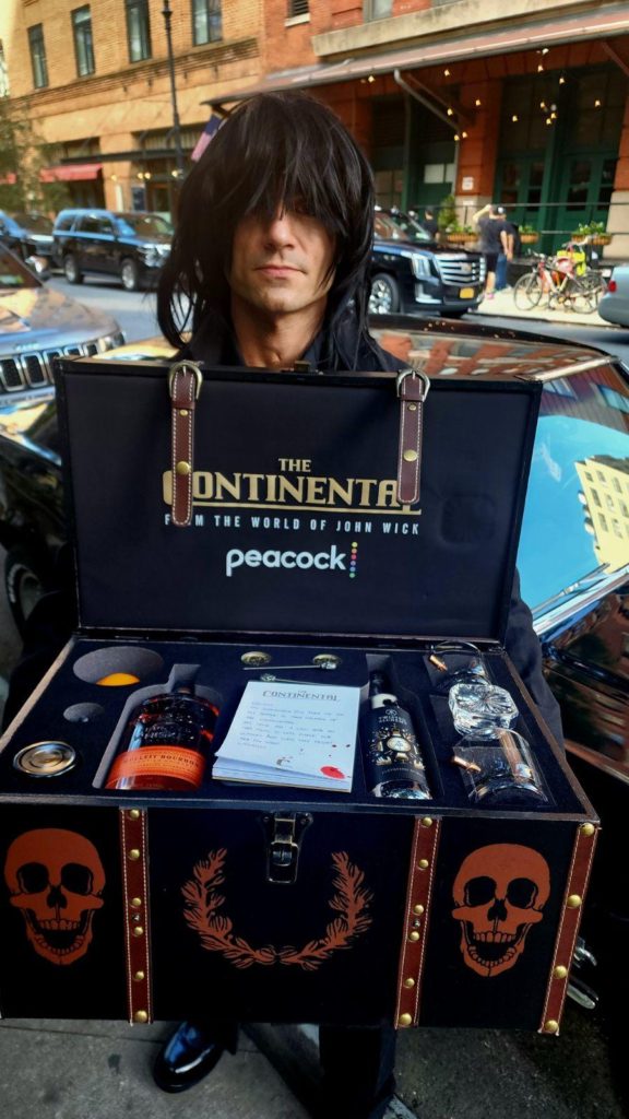 The crate — which looks pretty expensive — is to promote the Peacock Mel Gibson John Wick miniseries coming this weekend called “The Continental.”